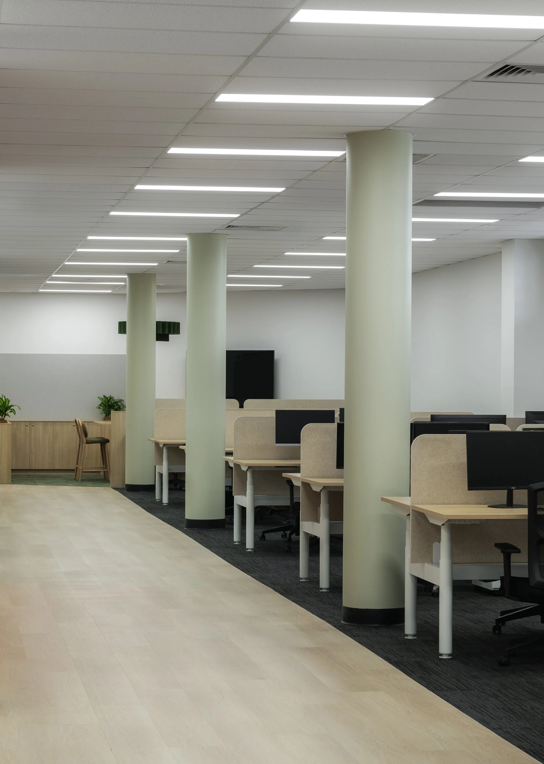 Soft tonal layering and subtle colour accents distinguish collaborative zones from focused work areas, while maintaining a seamless visual rhythm throughout. Breakout spaces become social hubs, balancing openness with comfort, while workstation pods and support areas foster productivity and ease.